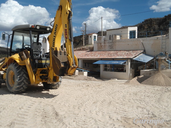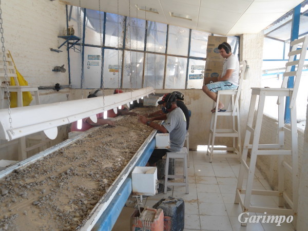 ベルトコンベアで送られてきた土砂を選別します。 パライバが入っているかもしれない砂とそうでない砂に分けます。 |